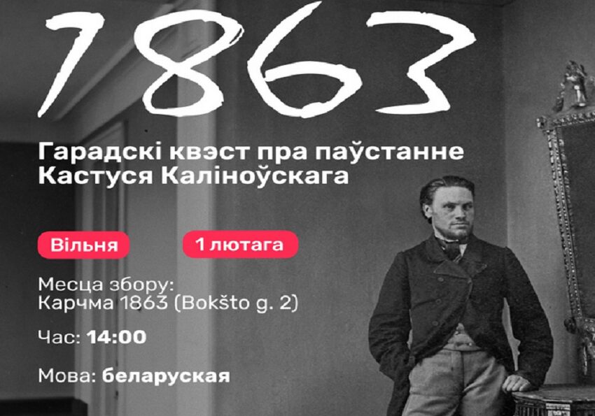 У нядзелю беларусаў Вільні клічуць на гарадскі квэст «1863», прысвечаны дню народзінаў Кастуся Каліноўскага. Сёлета лідару беларускага нацыянальнага вызваленчага руху спаўняецца ажно 188 гадоў. Квэст распачнецца ў знакавай карчме 1863 і там жа скончыцца вясёлай паўстанцкай вечарынкай у гонар спадара Кастуся! Каб прыняць удзел, трэба сабраць каманду ад 1 да 6 чалавек, выбраць назву і кіраўніка. Ён мусіць зарэгістраваць каманду. Калі вы без каманды — таксама рэгіструйцеся, можна будзе далучыцца да іншых або прайсці квэст самастойна. Таксама варта добра зарадзіць тэлефон і ўключыць мабільны інтэрнэт. Гугліць не толькі можна, але і трэба. Усе ўдзельнікі атрымаюць сувеніры, а пераможцы — адмысловыя падарункі.