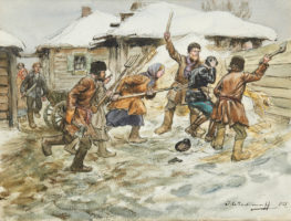 Касцяк Першага Беларускага партызанскага аддзела на чале з Лукашам Сяменікам (у цэнтры). Па правую руку ад яго – Юрка Моніч. За атаманам – Васіль Муха. Вёска Вялікае Стахава, 1919 год.