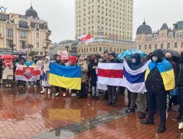 Упершыню на антываенную акцыю апроч беларусаў і ўкраінцаў выйшлі і расейцы пад бела-блакітна-белым сцягам.