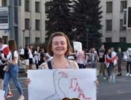 На «пакаяльным відэа» дзяўчына кажа, што ўдзельнічала ў акцыі пратэсту ў 2020-ым годзе — а менавіта, стаяла на дарозе з плакатам.